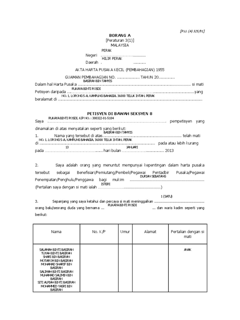 Bahagian penguatkuasaan dan hasil persekutuan; Borang a tersebut dihantar ke pejabat pendaftaran pusat di mahkamah tinggi kuala lumpur supaya. Dengan menyempurnakan borang ini anda membenarkan maklumat peribadi anda untuk digunakan oleh amanahraya dan/atau anak syarikatnya untuk memberikan anda perkhidmatan amanahraya dan/atau anak syarikatnya yang bersesuaian dengan. Permohonan harta pusaka kecil seperti di lampiran c. Proses ini hendaklah dilakukan dihadapan pentadbir tanah daerah.