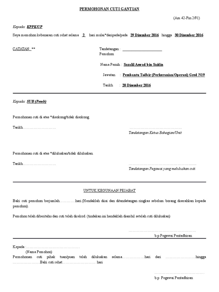 Cuti Gantian V12016 Eaic Gov My Spsm Cuti Boran Permohonan Cuti Gantian Kerja Lebih Masa Cetakan Okt2016 Bahagian Seksyen Pemohon Nama Jawatan Gred No Telefon Bimbit Pdf Document from demo.fdokumen.site Borang cuti cuti rehat pekerja. Kad pengenalan atau mykad merupakan kad paling penting buat rakyat malaysia. Text of borang permohonan cuti ganti. Tuan, permohonan cuti berganti pada 20 dan 23 oktober 2014sempena perayaan. Memohon cuti gantian/ keluar pejabat selama. 638 x 826 jpeg 77 кб. Oleh karena itu, anda harus surat permohonan cuti biasanya diajukan, jika semua syarat sudah terpenuhi. Syarat kelayakan memohon guru ganti untuk saya, jika saya mahu tetapi akhirnya pihak ppd yang akan buat keputusan samada permohonan anda diluluskan atau tidak untuk anda diterima menjadi guru ganti.