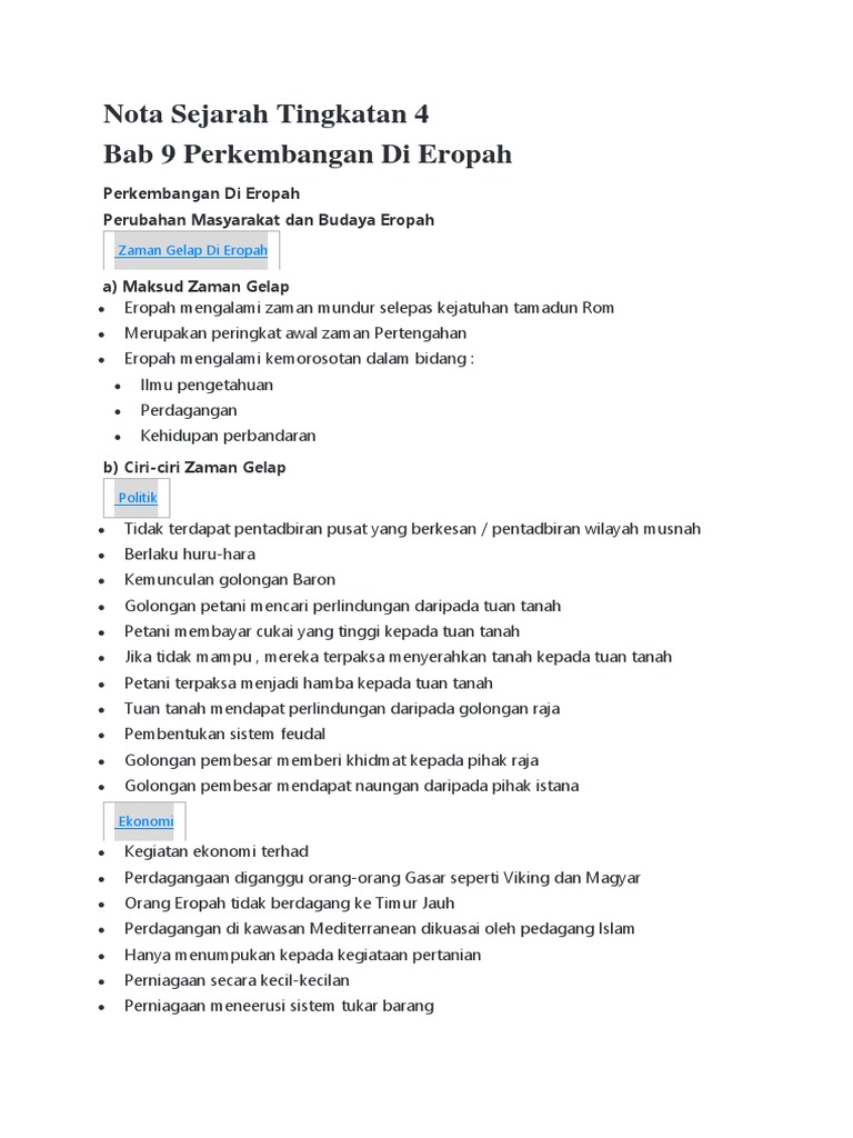 Text of sejarah tingkatan 4 (perkembangan di eropah). Di bawah adalah nota mata pelajaran sejarah tingkatan 4 bagi bab 1: Berbekalkan nota pada sejarah, anda pelajari pelbagai sejarah dan tamadun. Kerajaan islam di madinah perkembangan di eropah. Zaman pertengahan terbahagi 3 iaitu peringkat awal, kemuncak dan akhir.