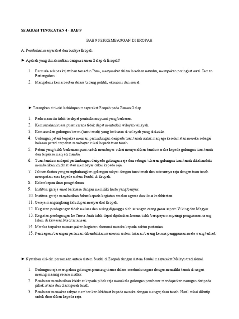 Bab 9 from imgv2-1-f.scribdassets.com Nota sejarah tingkatan 4 cikgu sarapa ismail mrsm pengkalan chepa bab 3 : Perkembangan eropah kssm tingkatan 4. Text of sejarah tingkatan 4 (perkembangan di eropah). Anda juga akan mempelajari tentang pembangunan di eropah dan polisi yang dilaksanakan semasa penjajahan inggeris di malaysia serta bagaimana keadaan ini memberi kesan kepada sistem ekonomi kita. Perubahan masyarakat dan budaya eropah. Pembentukan kerajaan islam dan sumbangannya. Sejarah tingkatan 4 merupakan permulaan subjek sejarah yang sangat menarik. Ittv spm tingkatan 4 ekonomi bab 1 pengenalan (konsep kekurangan, pilihan dan kos lepas).