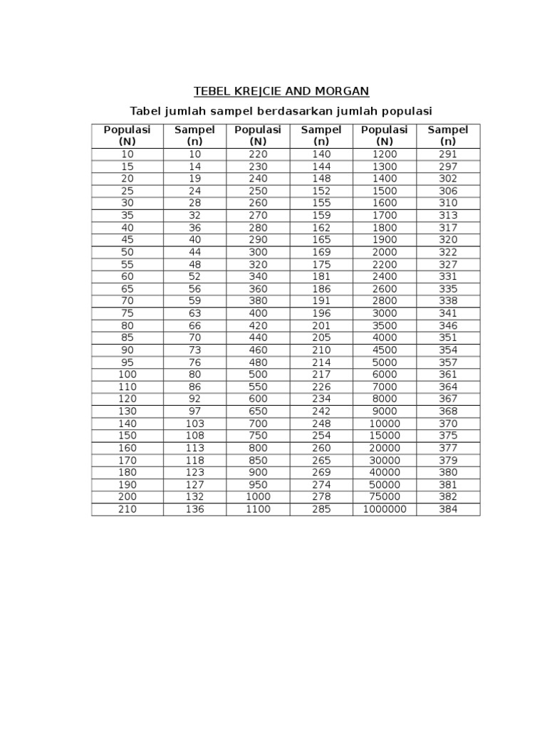 The krejcie and morgan table help the researcher to determine the sample size. Krejcie regrettably a table has not bee available for ready, easy reference which could have been constructed using the following formula. (found on the kenpro web site www.kenpro.org which addresses issues of project management.) appendix d: One of the most used method is the krejcie and morgan sampling method. It is krejcie & morgan (1970) table of sample size determination. There is no need of using the formula since the table of determining sample size has all the provisions you require to arrive at your sample size. We then drew a statistically representative sample from each bucket. To address the existing gap, krejcie & morgan (1970) came up with a table for determining sample size. No calculations are needed to use table 1. So, the researcher does not need to make the study on each of the sample. Krejcie university of minnesota, duluth. The krejcie and morgan table (kmt, krejcie & morgan, 1970) is well known for sample size determination among behavioural and social science researchers. Based on krejcie and morgan's (1970) table for determining sample size, for a given population of 500, a sample size of 217 would be needed to represent a crosssection of the population.